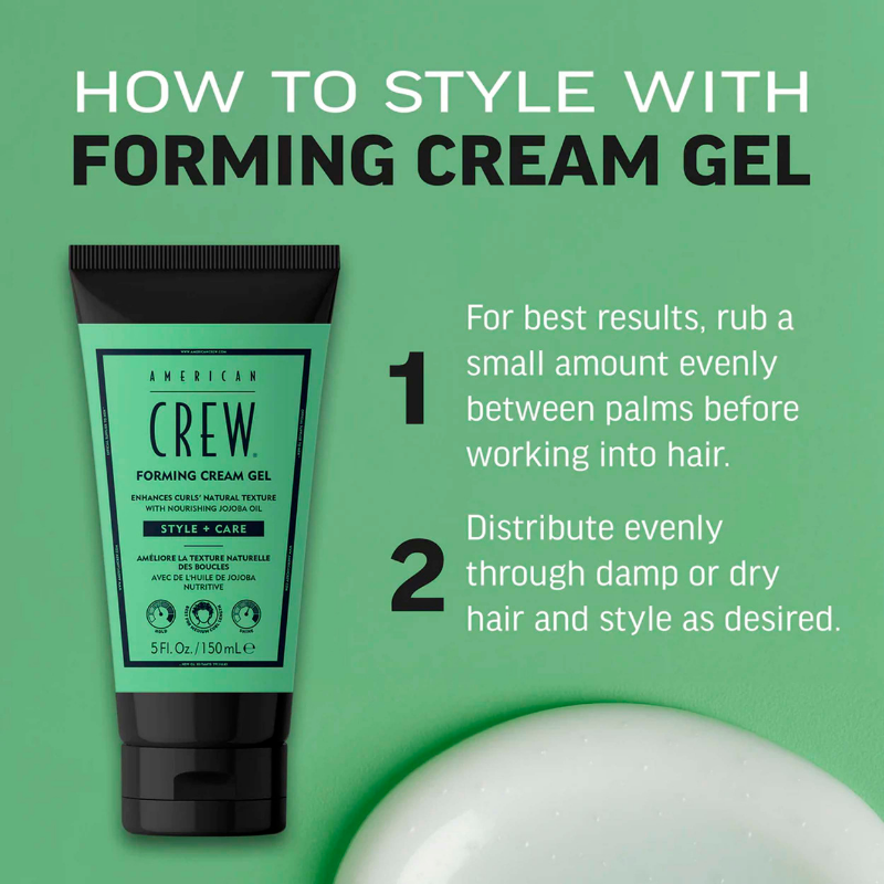 American Crew Forming Creme Gel 150 ml American Crew Forming Cream Gel leverer moderne styling til krøllet hår med en ren og effektiv formel udviklet til mænd. Den lette creme-gel-hybrid giver definition og kontrol til strukturerede krøller og reducerer frizz hele dagen. Med en glidende påføring og fleksibelt hold kan du forme håret uden hverken stivhed eller produktopbygning. Beriget med jojobaolie er denne gel skabt til mænd med krøllet eller kruset hår, der ønsker enkel styling og skarpe krøller.