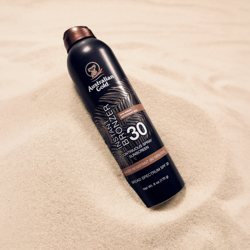 360° spray, som sikrer en nem og let påføring på hele kroppen fra alle vinkler Australian Gold® Instant Bronzer Continuous Spray SPF 30 giver en øjeblikkelig glød til huden og er ideel til, hvis der ønskes en hurtig påføring kombineret med lidt farve.