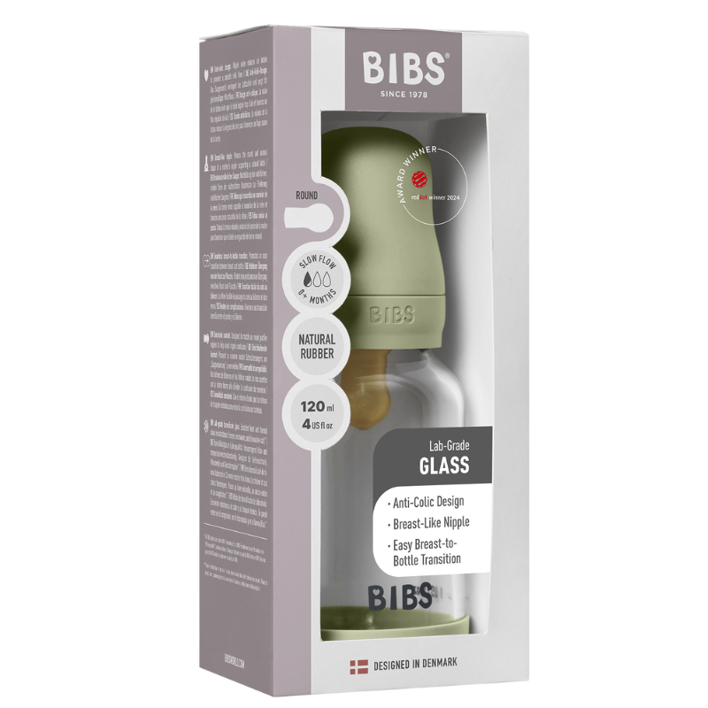 Bibs Glass Baby Bottle Round Latex Slow Flow Sage (120 ml)