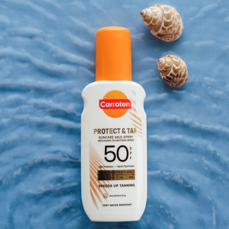 Solbeskyttelse og tan booster Carroten Protect & Tan Milk Spray SPF 50 beskytter effektivt huden og fremmer samtidig en smuk, gylden glød.