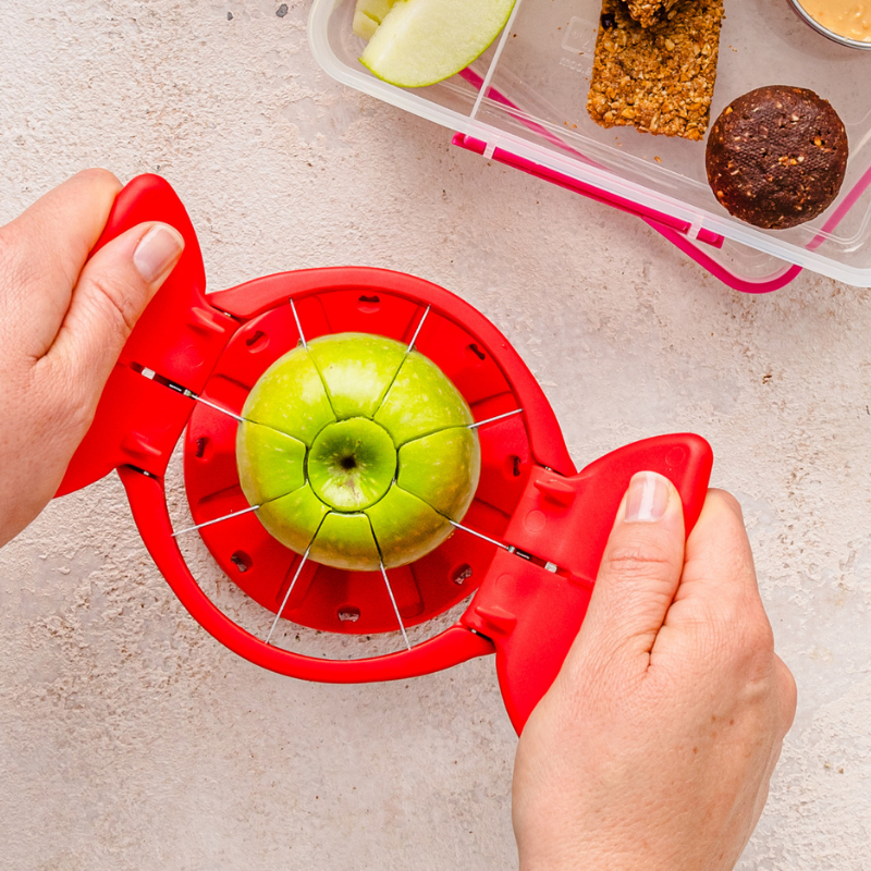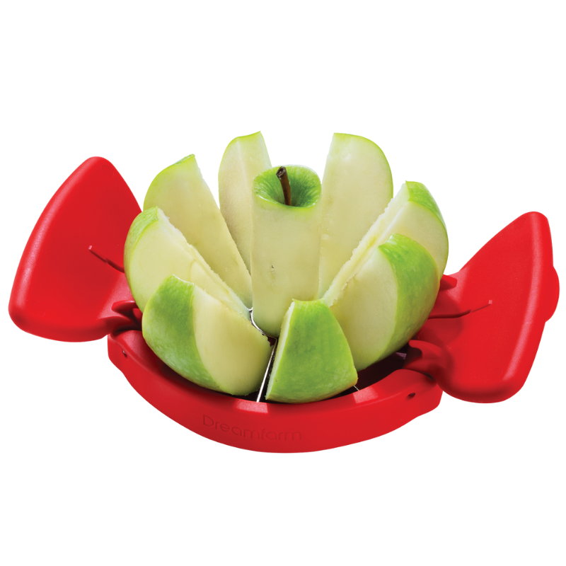 Flapple æbleskærer Flapple fra Dreamfarm er en flot designet og ultra skarp æbleskærer og udkerner. De hævede håndtag sikrer et godt, fast greb og det formstøbte bundstykke sikrer, at æblet altid skæres helt igennem. Det smarte og funktionelle design gør at Flapple kan foldes helt ned og derfor fylder minimalt i skuffen. Når håndtagene foldes ned, hæftes bundstykket samtidig fast, hvilket giver en sikker opbevaring samtidig med at skæret beskyttes. Flapple deler æblet i 8 lige store stykker, og er produceret i dobbeltforstærket japansk rustfrit stål, som giver et ultraskarpt og holdbart skæreblad. Materialet er polypropylene og rustfrit stål. BPA-fri og tåler opvaskemaskine.