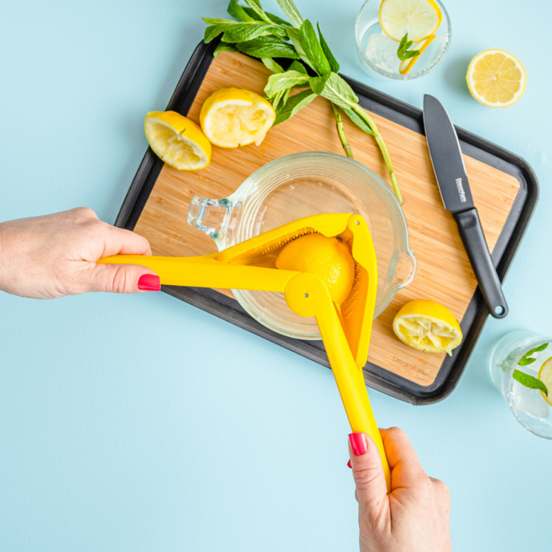 Fluicer citruspresser Fluicer fra Dreamfarm er en manuel citruspresser, der fås i tre forskellige størrelser, - til lime, citron eller appelsin. Designet så de større muskelgrupper i dine arme skal anvendes i stedet for hænderne, hvilket kræver færre kræfter end en traditionel citruspresser. Den specialdesignede mekanisme presser frugten på midten fra siderne, lige som at presse frugt med hænderne, hvilket kræver mindre kraft end at presse frugten flad som traditionelle pressere. Den indbyggede kerneopsamler giver ekstra kontrol ved at fungere som en tragt, og dirigerer juicestrømmen ind i et glas eller en lille skål. Udarbejdet i et slimline design, så Fluicer kan foldes helt fladt efter brug, så den nemt passer i skuffen. Materiale er polypropylen og rustfrit stål. Tåler opvaskemaskine. BPA fri. Medium mål: 250x104x30.
