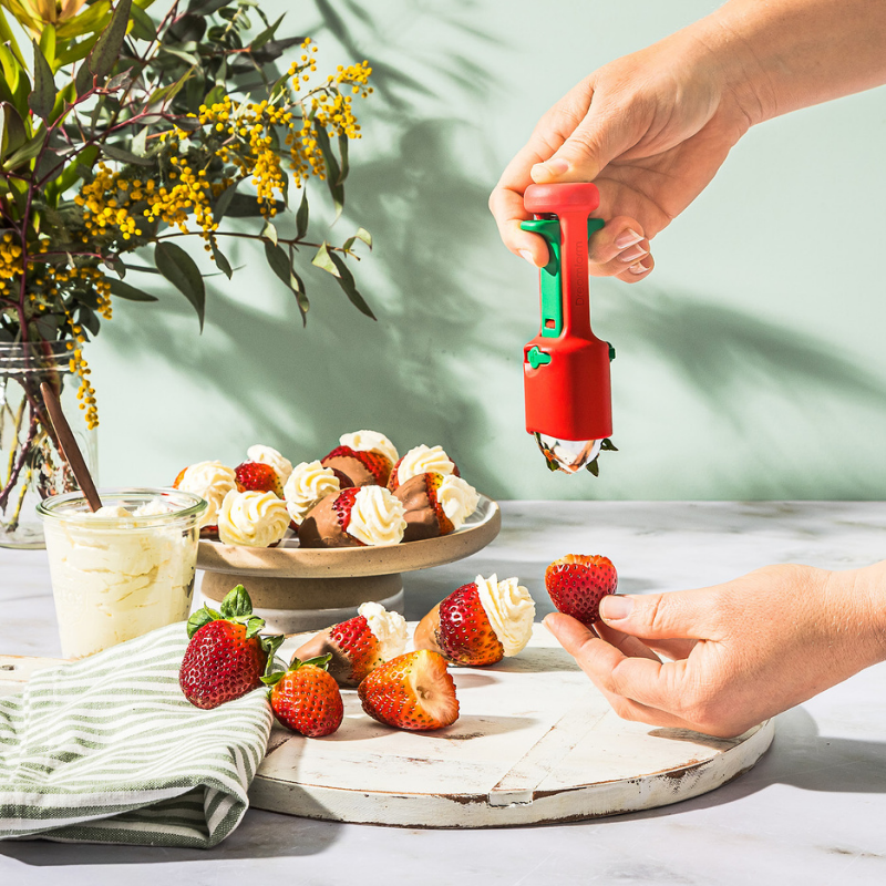 tomatudskiller, en ananasøjefjerner og en kirsebær- og olivenudskiller i ét værktøj, der kan lukkes for kompakt opbevaring. Bladene i rustfrit stål er konisk tilspidsede til at fjerne bitre jordbærkerner og frugtpletter. Hullapit udstener kirsebær og oliven i alle størrelser med det fjederbelastede stempel i én bevægelse, fanger sten og kerner og frigiver dem derefter. Det unikke dobbeltkammer-design opsamler sten og kerner, forhindrer saftsprøjt og beskytter tøj, hænder og arbejdsflader mod pletter. Tåler opvaskemaskine. Materialer er: GF Polypropylen og rustfrit stål.