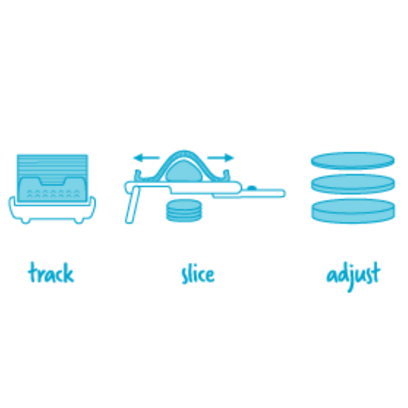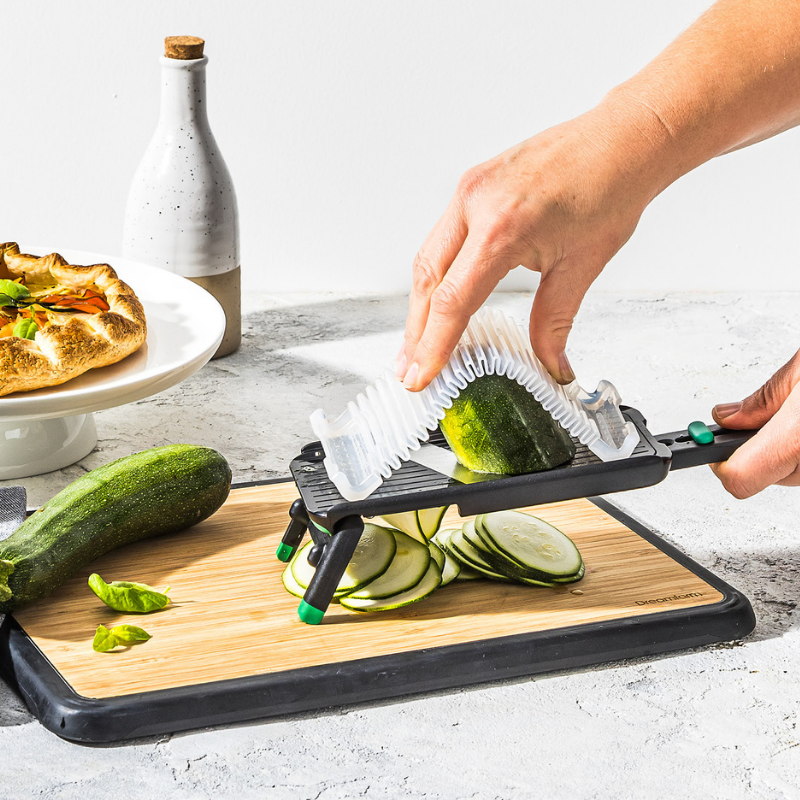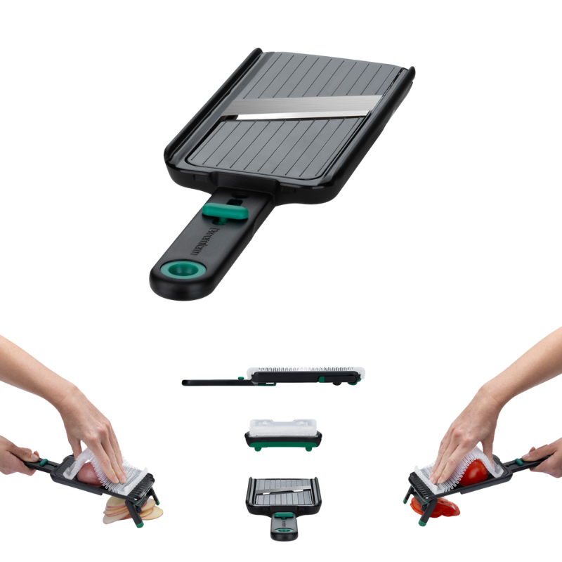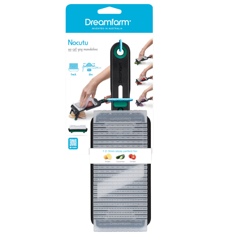 Nocotu mandolinjern Nocutu er et mandolinjern med en unik og fleksibel fingerbeskyttelse, der kører på skinner for at skære sikkert helt ned til den sidste skive. Det knivskarpe japanske blad i rustfrit stål skærer i tykkelser på 1 mm, 2 mm og 3 mm og kan låses for sikker opbevaring i skuffen. Den integrerede, skridsikre fod kan foldes ud for at hæve Nocutu sikkert, så der kan stables flere madskiver nedenunder uden at de kommer i klemme. Den fleksible fingerbeskyttelse kan klikkes på og fungerer også som knivdæksel til sikker og nem opbevaring. Tåler opvaskemaskine. Materiale er: ABS, polypropylen, rustfrit stål.