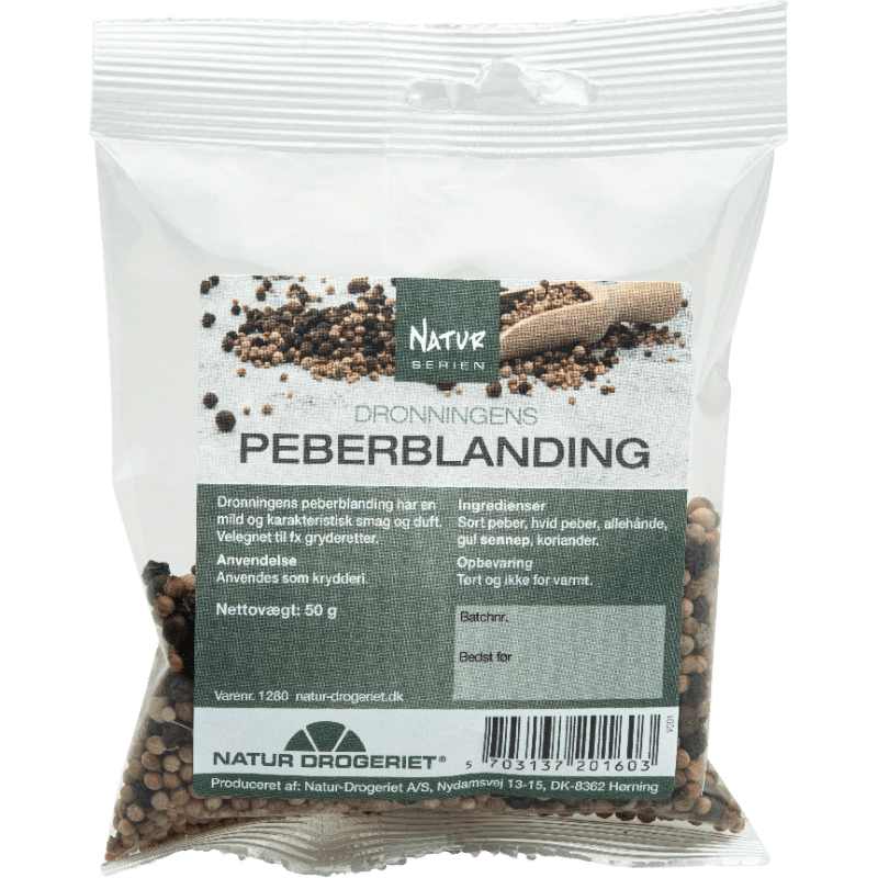 Dronningens peberblanding fra Natur Drogeriet er et skønt mix af forskellige slags pebre og andre krydderier.
