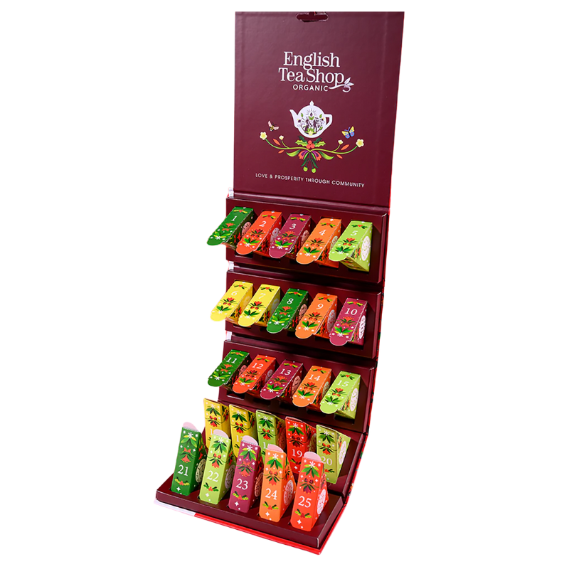 Nu det jul igen med English Tea Shop Skab ægte julestemning med vores unikke væg julekalender. Denne julekalender fungerer både som hyggelig julepynt og som en daglig forkælelse med økologiske teer. Bag de 25 teposer gemmer sig alt fra den opløftende Holiday Boost til den populære Winter Balance.