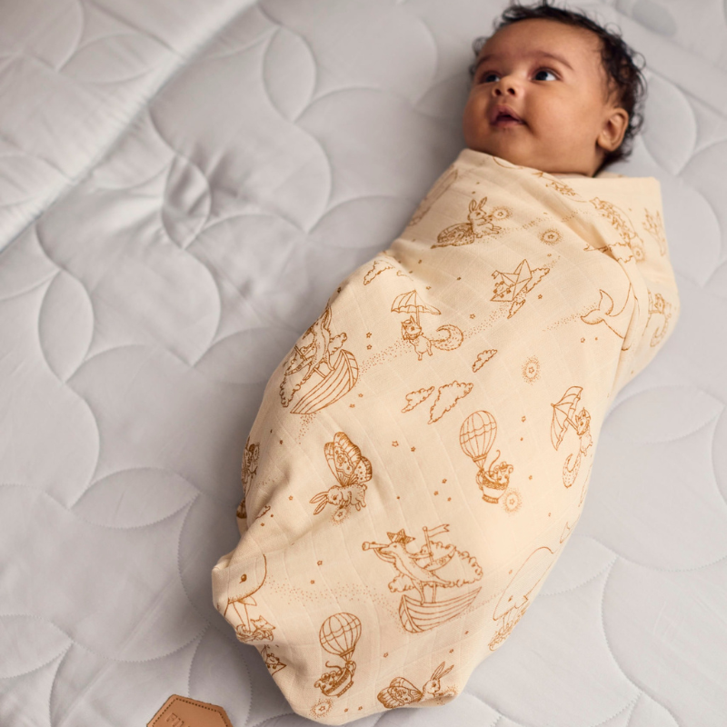 Stor stofble / svøb 120x120 cm GOTS - Dreamy Adventurers Der er noget magisk ved at svøbe sit barn i et blødt og beroligende tæppe. FILIBABBAs muslinsvøb er designet til at skabe hyggelige øjeblikke, der giver både forælder og barn en følelse af ro og nærhed. Det løst vævede og åndbare stof sørger for, at dit barn føler sig trygt og komfortabelt uden at blive for varmt. Udover at være ideelt til at svøbe din baby kan det også bruges som ekstra lag i kravlegården eller som et let tæppe om sommeren.