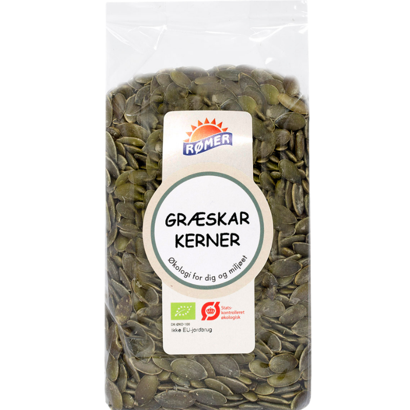 Græskarkerner er næsten et must i ethvert køkken! Disse græskarkerner fra Rømer er økologiske og er i særdeleshed gode i brød, müsli eller som drys på salater.