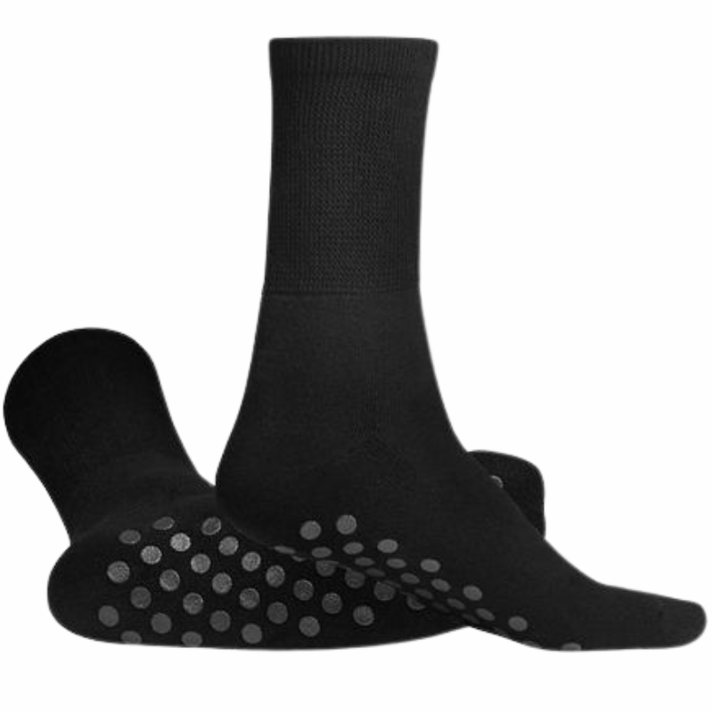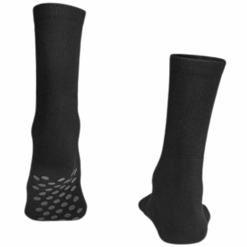 Komfort & Diabetes Anti-Skrid strømpe i blød bomuld Strikket af en blød og behagelig bomuld med frotte i indersiden af fodsålen og silikone dupper på ydersiden, så du står godt fast - selv på glatte gulve.