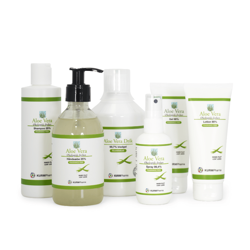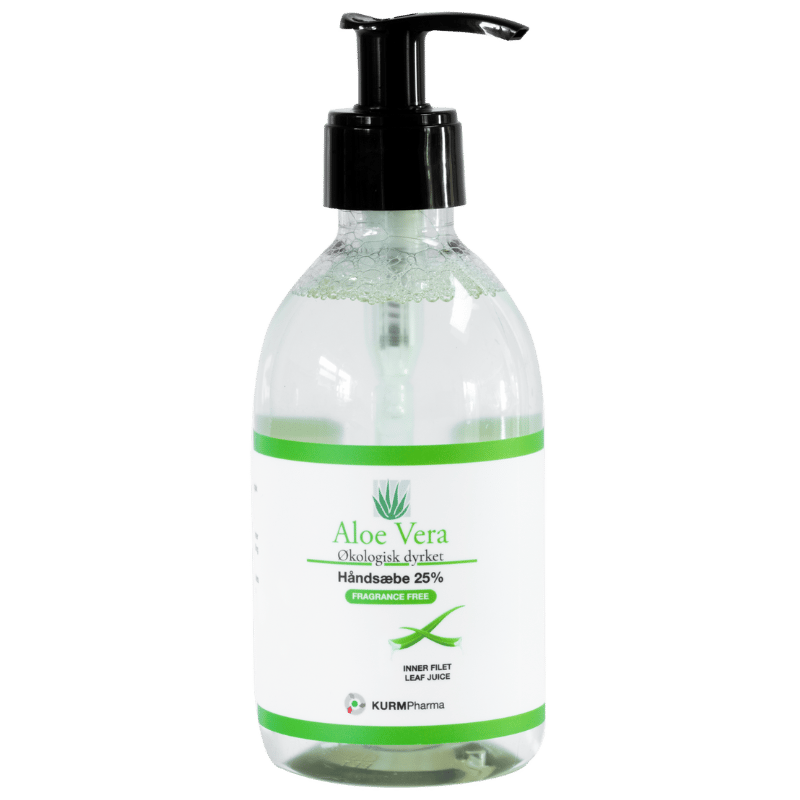 Hovedingrediensen i KURM Aloe Vera Håndsæbe 25% (300 ml) er en høj koncentration af aloe vera, som er kendt for sine fugtgivende og beroligende egenskaber. Dette høje indhold sikrer, at huden modtager intensiv pleje ved hver vask, hvilket hjælper med at bevare den naturlige fugtbalance. Da formularen er helt uden tilsat parfume, er den særligt mild mod huden.