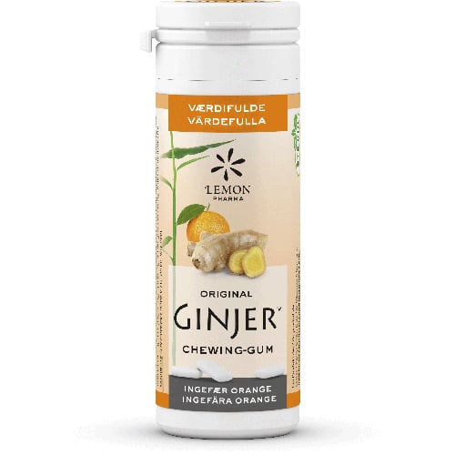 Tyggegummi fra Lemon Pharma med lækker smag af ingefær og appelsin. Tyggegummierne er sødet med Stevia og Xylitol.