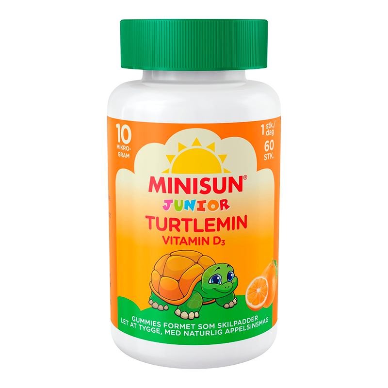 Gør det sjovt for dine børn at spise D-vitamin med Minisun Turtlemin Junior, som er et velsmagende vitamin D-tilskud.