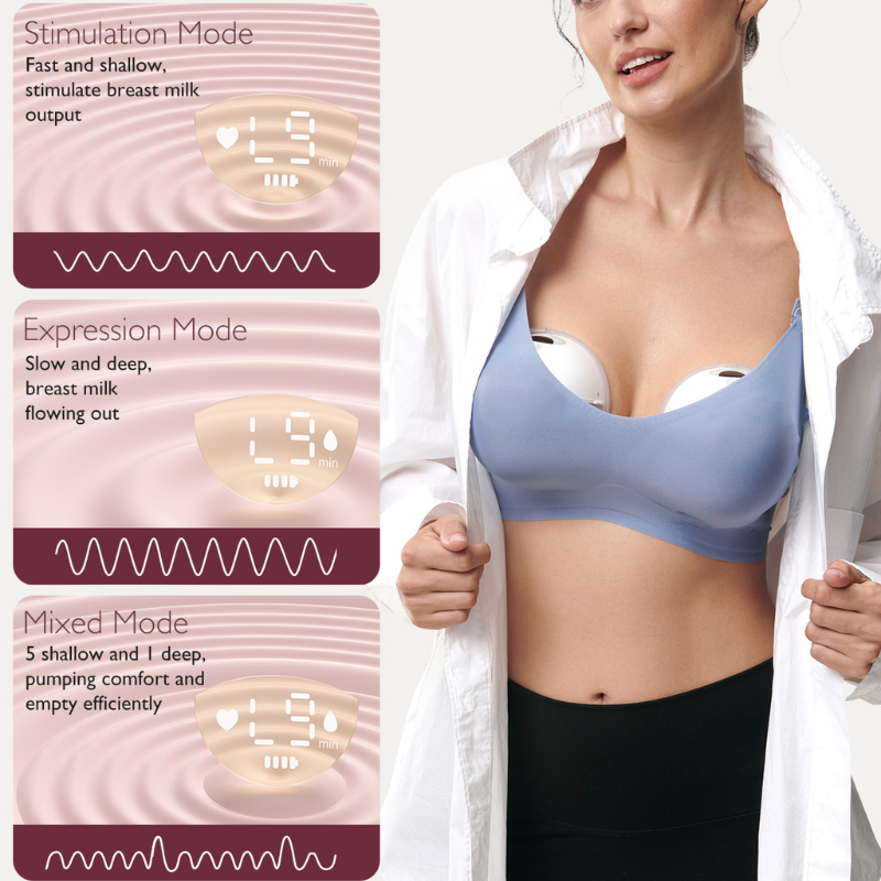 - 3 Specialiserede Tilstande: Vælg mellem stimulation, udmalkning og en opgraderet "Mix-tilstand", der vibrerer under brug for at forebygge brystspændinger