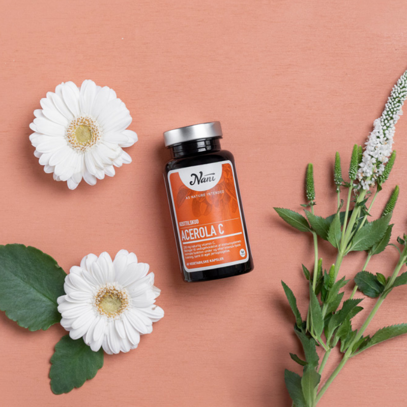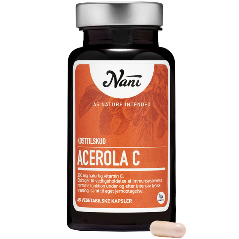 Acerola C vitamin af pulveriserede acerola kirsebær Nani Acerola C-vitamin er et kosttilskud med naturligt indhold af C-vitamin fra tørrede og pulveriserede acerolakirsebær.