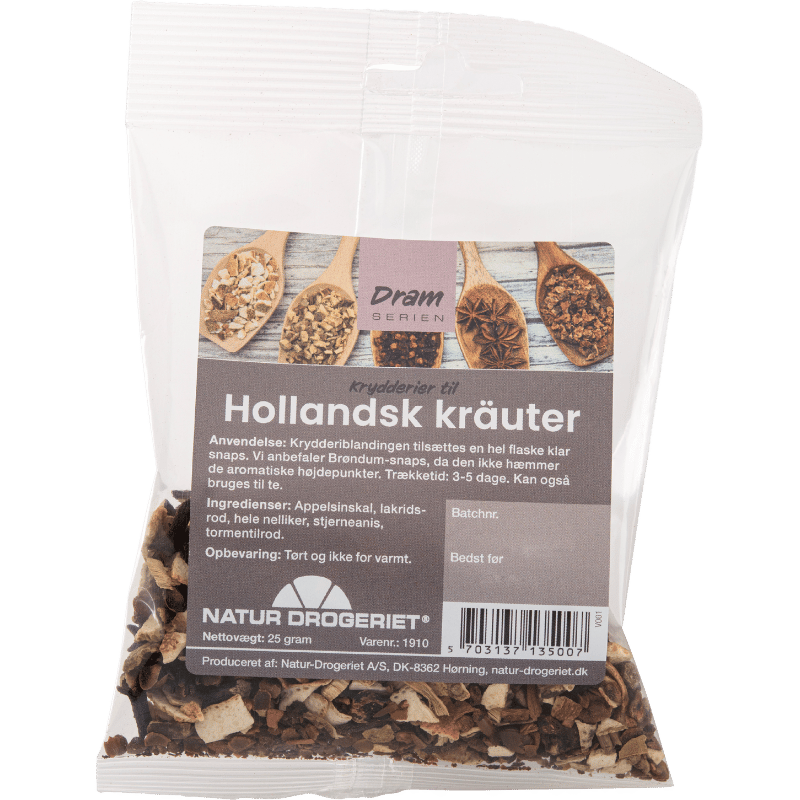 Natur Drogeriet Hollandsk Krauter Krydderiblanding (25 gr) er et velsmagende krydderi, der er perfekt til snaps, men som også kan bruges som et teudtræk.