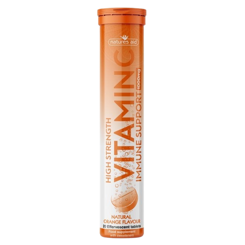 Vitamin C fra Natures Aid er en brusetablet med appelsinsmag, der gør det endnu nemmere at indtage dine C-vitaminer. Tabletterne bidrager til normal dannelse af kollagen, der har betydning for normalt fungerende knogler, tandkød, tænder og hud. Vitamin C bidrager derudover til immunsystemets normale funktion, særligt under og efter fysisk aktivitet, hvor træthed og udmattelse kan mindskes. Ydermere bidrager Vitamin C til at beskytte cellerne mod oxidativt stress og øger optagelsen af jern.