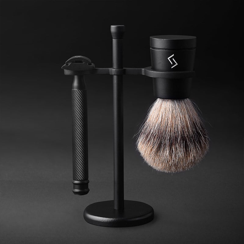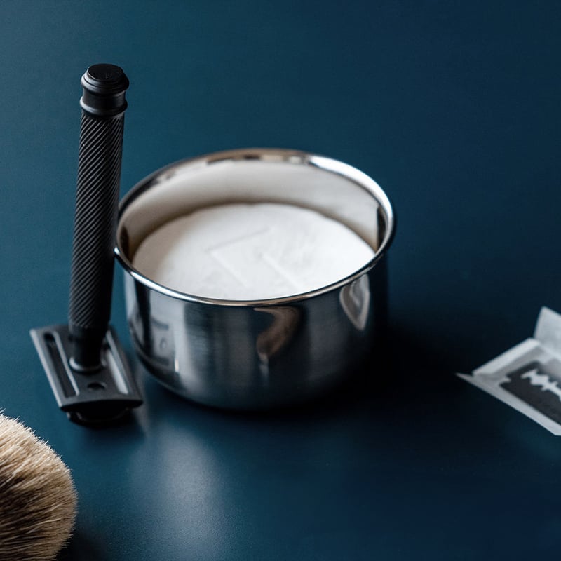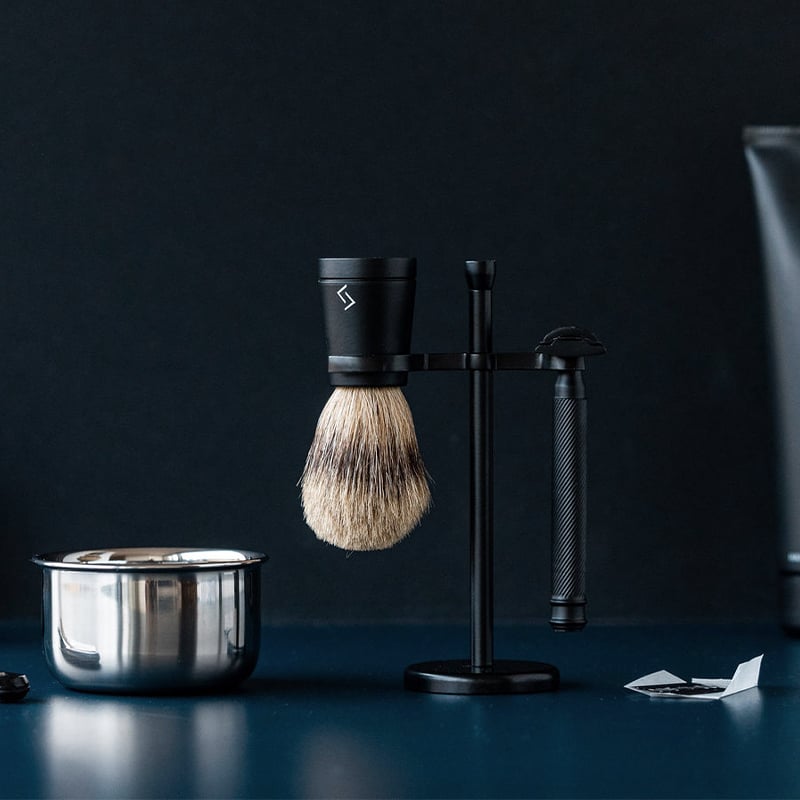 Njord Shaving Bowl i rustfri stål, Njord Razor & Brush Stand, 5 stk. Double Edge blade, samt en Njord toilettaske.