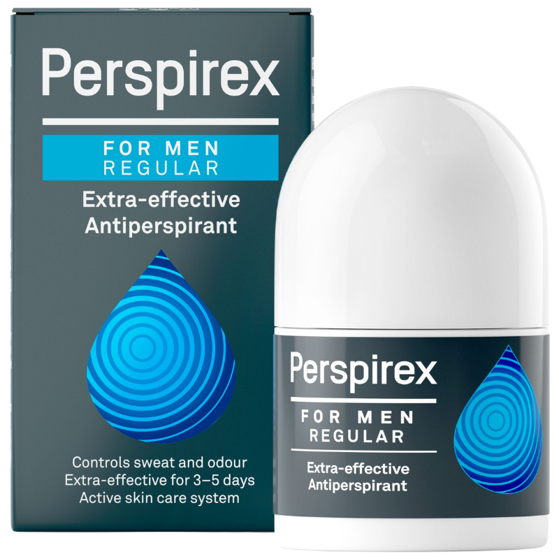 Regular For Men Extra-effective Antiperspirant Perspirex for Men Regular er en klinisk dokumenteret og ekstra effektiv antiperspirant til kraftig svedproduktion. Den indeholder et aktivt hudplejesystem, der beskytter mod både sved og lugt i op til 5 dage.