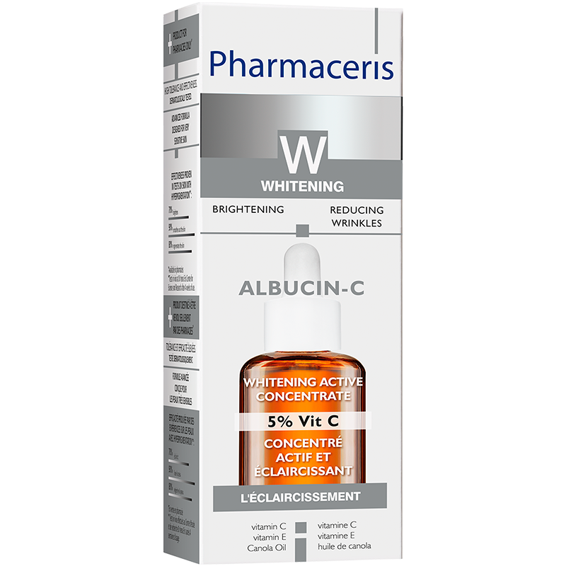 Pharmaceris W's serum indeholder C-vitamin, som lysner pigmentpletter og udjævner hudens tone. Serummet stimulerer også syntesen af collagenproteiner, reducerer rynker og øger hudens elasticitet og tæthed.