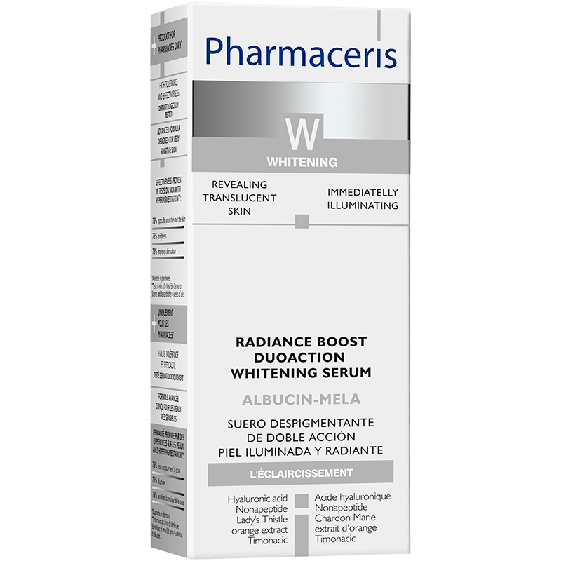 Albucin-Mela Duo er et aktivt lysnende serum, der bekæmper hyperpigmentering og ujævn hudtone. Serummet indeholder en biomimetisk peptid, der reducerer misfarvninger ved at hæmme receptorer i de dybere hudlag, og kan bruges som en base for dagcreme eller som en let dagcreme.