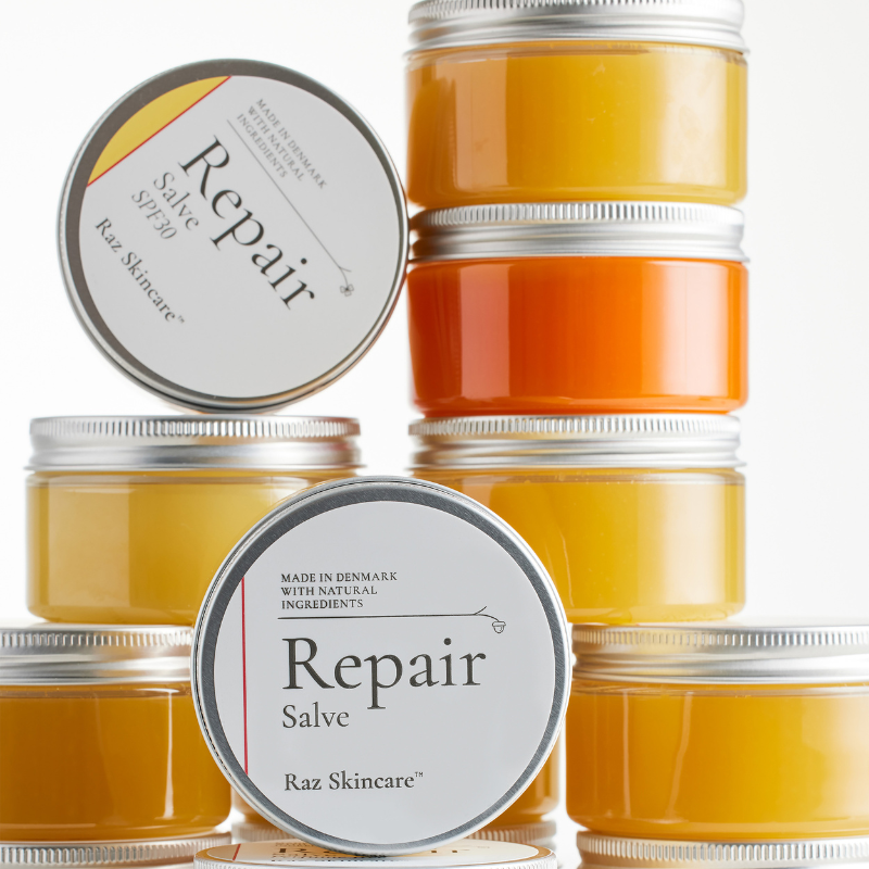En fantastisk helende salve med SPF30, der beskytter mod solens skadelige stråler og plejer huden i dybden. Raz skincare's bedst solgte produkt! Repair Salve SPF30 er ideel til skiferien, hvor den beskytter læber, kinder og næse mod både kulde, frostskader og solens skadelige stråler. Ligesom den originale Repair Salve lindrer den irritation, sår, eksem, tør/sprukken hud, tørre læber og flossede neglebånd.