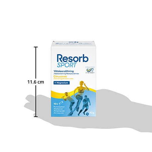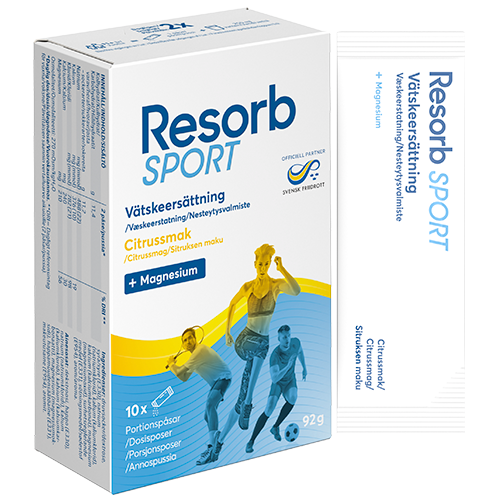 Kosttilskud. RESORB Sport (10 stk) er en væskeerstatning, der kombinerer kulhydrater med en elektrolytopløsning af mineraler. Dette tilskud indeholder en kombination af magnesium og calcium, som bidrager til at mindske træthed og udmattelse og til at understøtte et normalt energistofskifte. Det praktiske tilskud kommer i form af et pulver, der er individuelt indpakket i poser og er let at have med på farten. Produktet har en frisk smag af citrus.