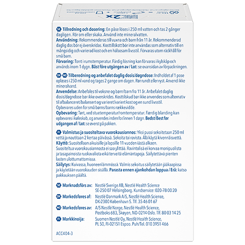 Anvendelse Tilsæt pulveret fra 1 pose til 250 ml væske. Rør eller ryst til pulveret er opløst. Indtag 1 pose 2 gange dagligt.