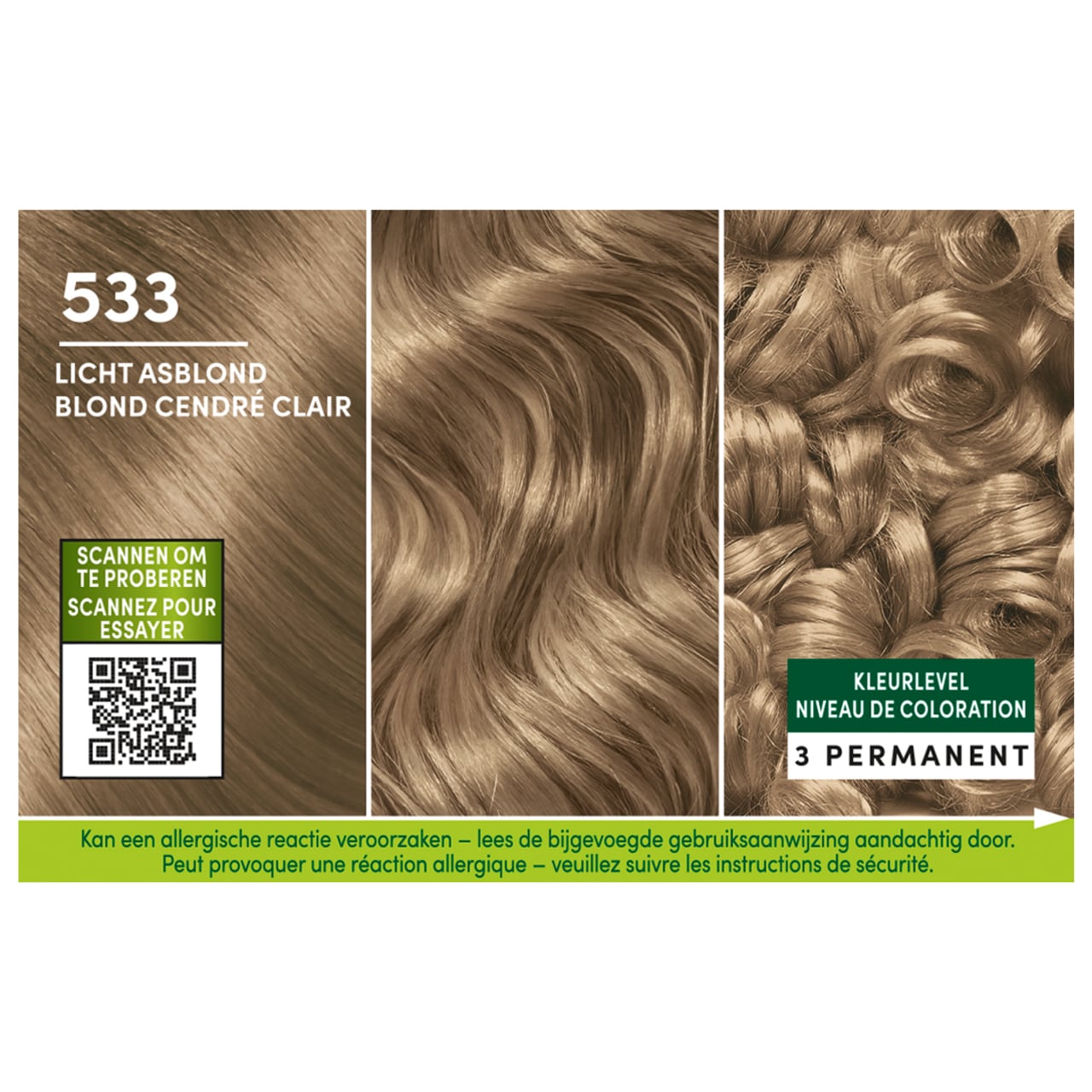 Hårfarve, der giver en kølig, askeblond nuance. Med skånsomme ingredienser får du en farve, der dækker gråt hår, og som er nem at arbejde med. Formlen er udviklet til at give et naturligt udseende og beskytte dit hår under farvningen.