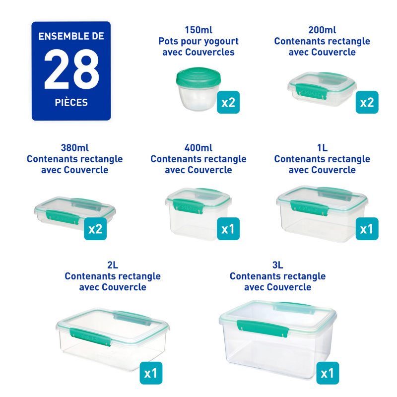 Sistema Klip It 28 dele teal Dette smarte opbevaringssæt fra sistema indeholder følgende: 1 x 3 L Klip It, 1 x 2 L Klip It, 4 x 1 L Klip It, 2 x 400ml Klip It, 2 x 380ml Klip It, 2 x 200ml Klip It, 2 x150ml med skruelåg.