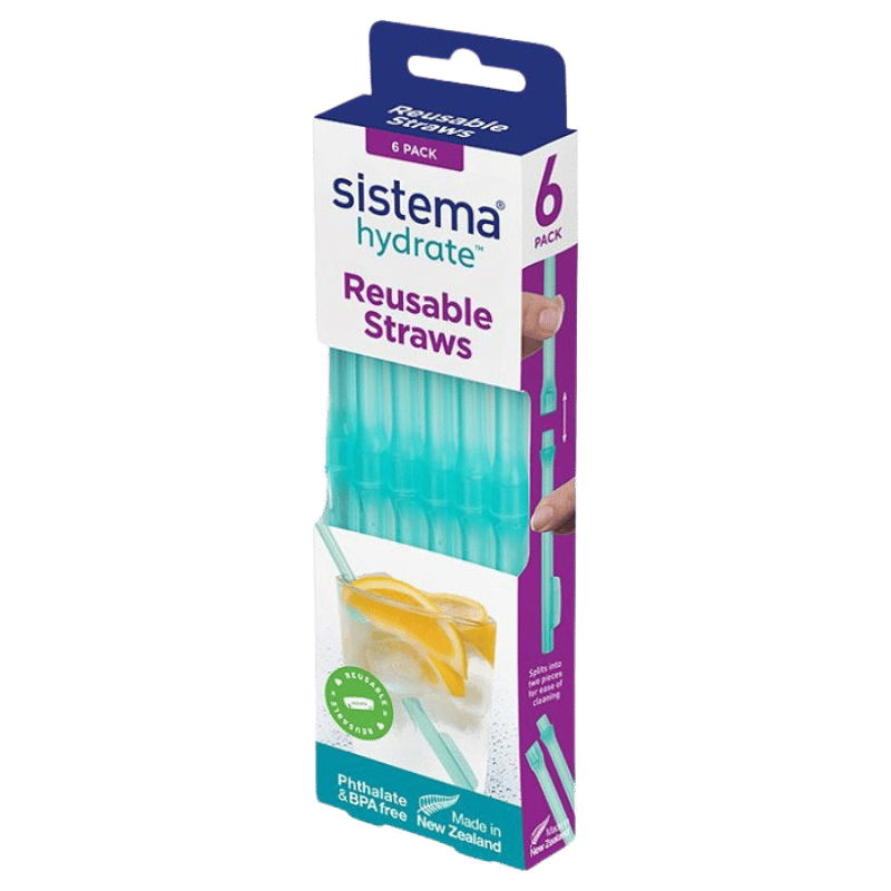 De genanvendelige sugerør fra Sistema kommer i en pakke med seks i blå og kan deles på midten for endnu nemmere rengøring og opbevaring - og de kan endda gå i opvaskemaskinen!
