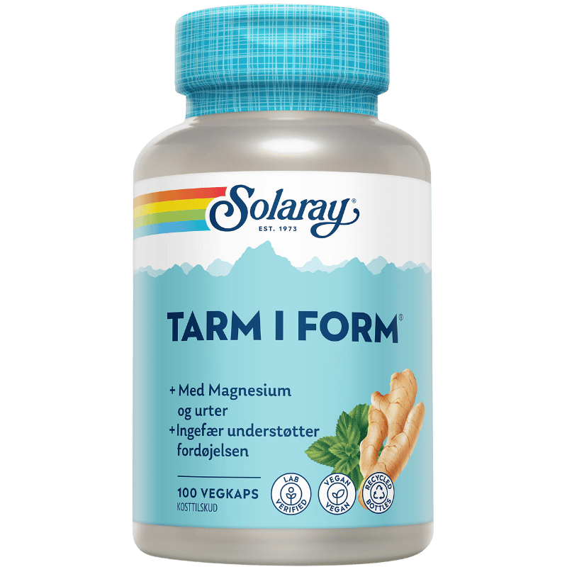 Kosttilskud. Tarm i Form fra Solaray indeholder en kombination af urter og magnesium. Urteblandingen består af bark fra grå valnød, figenfrugt, sveskefrugt, ingefærrodekstrakt, pebermynteblade og glat burre rod. Produktet er kapselbaseret og velegnet til voksne og børn fra 11 år.