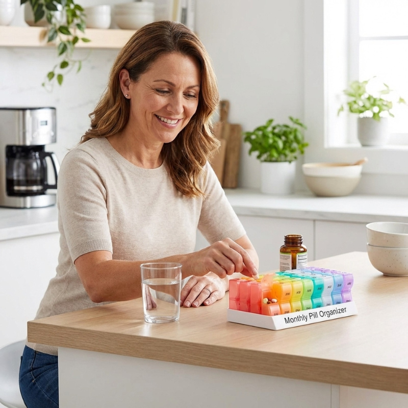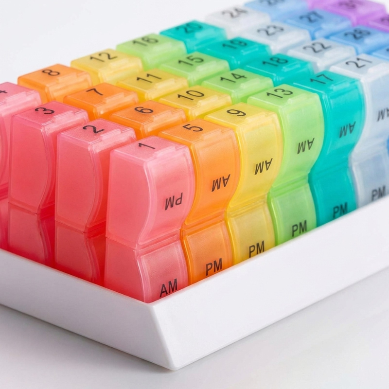 Månedsorganizer der gør det nemt at planlægge medicin og vitaminer 31-dages medicin organizer med stor kapacitet og 32 rum, så du kan planlægge og holde overblik over piller/vitaminer over længere tid. Velegnet til hjemmebrug og rejser.