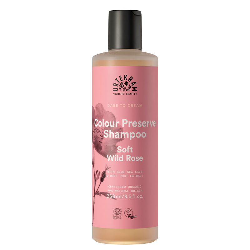 En nærende shampoo fra Urtekram med forførende duft af rosengeranium og vilde roser. Shampooen indeholder nærende og naturlige ingredienser såsom glycerin og aloe vera. Disse er både gode for din hovedbund, men tilføjer både fugt og styrke til dit hår, så dit hår undgår at tørre ud og holder sig stærkt gennem dagen. Shampooen er især velegnet til farvet hår, da ingredienserne såsom strandkål og rødbedeekstrakt går ind og beskytter din hårfarve og gør farven længerevarende.
