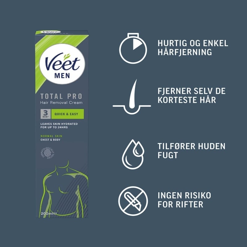 Veet For Men Cream er formuleret til at være skånsom mod selv følsom hud. Du kan bruge den på brystet, ryggen, armene og benene. Den praktiske tubestørrelse sikrer, at du har nok produkt til flere behandlinger, og den er nem at have med på rejsen. Cremen giver dig fleksibilitet til at fjerne hår, når det passer dig, uden at skulle bestille tid hos en professionel.