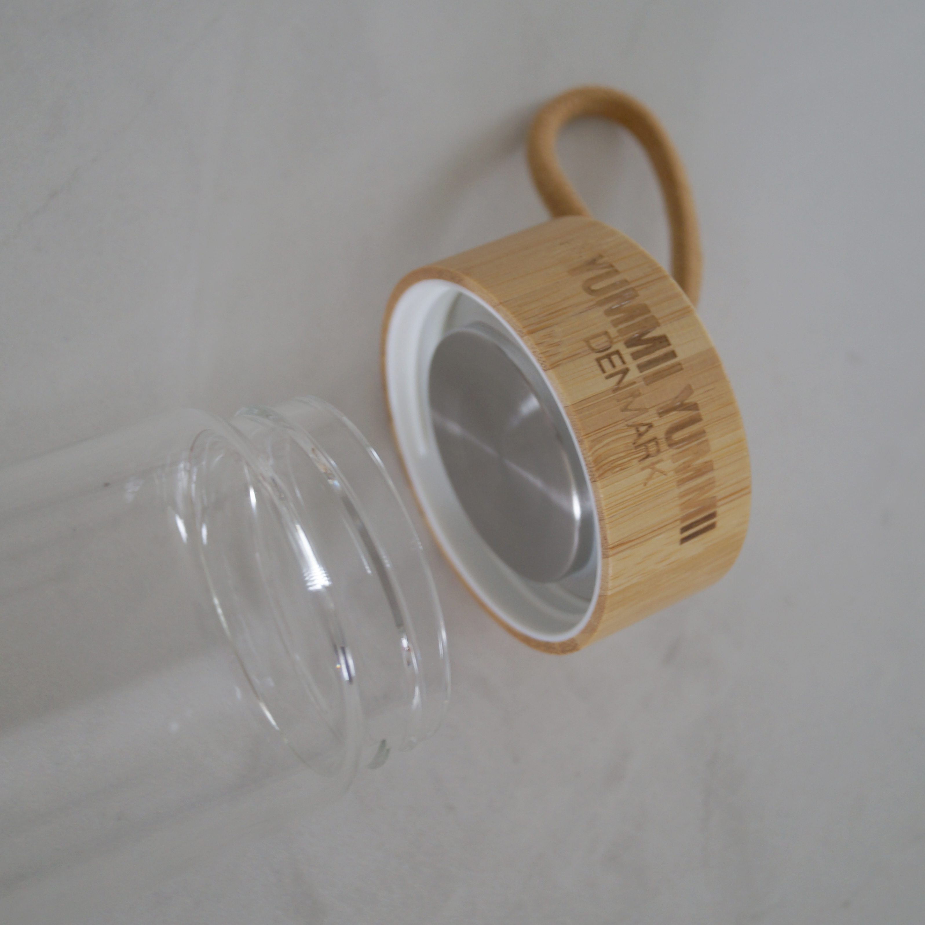 Stilren thermo glasflaske fra Yummii Yummii der er perfekt til juice, smoothies, te, infuseret vand og meget andet. Flasken har et enkelt og stilrent design med glas og bambuslåg. Den kommer med en aftagelig infuser i rustfri stål, der kan bruges til te eller til at infusere vandet med citron, ingefær eller andre frugter, så det får en skøn smag. Flasken er lavet med et dobbelt lag af barosilikat glas, som gør, at den ikke bliver varm at holde ved, når der er varme drikke i den. Den er perfekt at have med på farten og på udflugter.